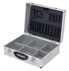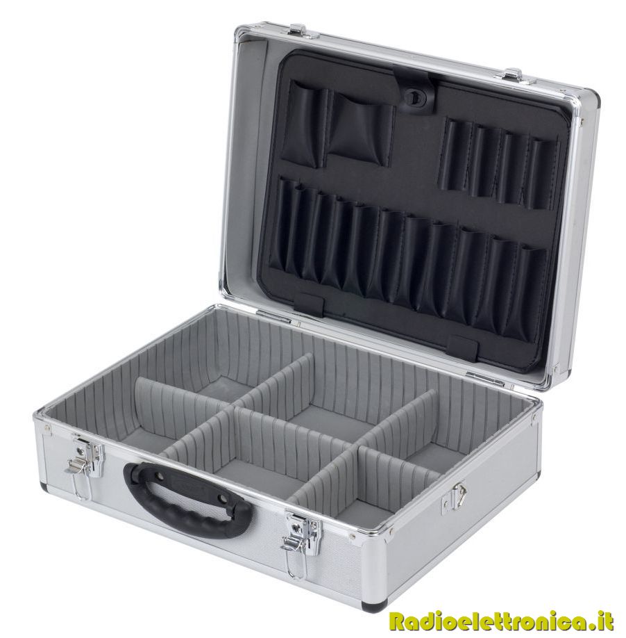 Comoda e utile valigia in Alluminio, studiata appositamente per il trasporto di tutti gli utensili di cui ha bisogno il professionista. É dotata internamente di divisori mobili che la rendono completamente personalizzabile. Dimensioni: 460 x 304 x 170 mm Chiusura con chiavi Colore: silver