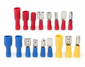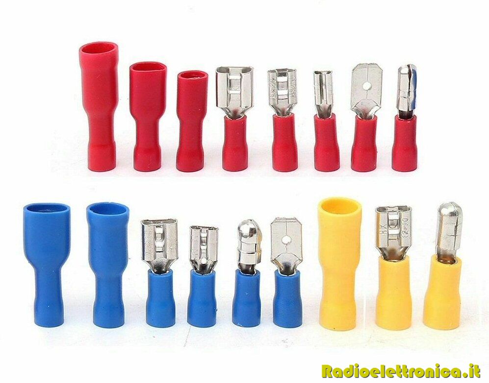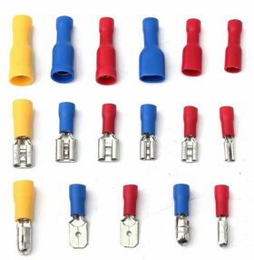 Assortimento di 120 capicorda preisolati in 18 diversi formati, piatti maschio, piatti femmina, a forchetta, a pressione ed altri.