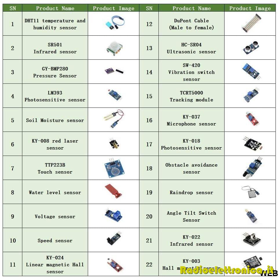 • Tutti i kit di sensori sono accuratamente selezionati e testati. Rimossi i moduli inutili e meno usati. Eliminiamo molti sensori obsoleti che hanno bassa affidabilità e funzione duplicata come altri sensori nel kit.
