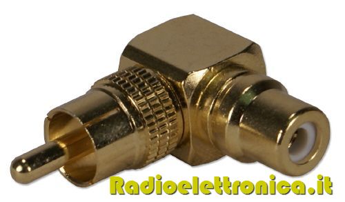 Adattatore dorato spina RCA/presa RCA 90°. Manicotto in metallo, completamente dorato. Dimensioni esterne complete del contatto che va inserito: 33,0mm. (lato maschio) e 25,0mm. (lato femmina). Angolo di 90 gradi. Prodotto per installazioni in vani difficoltosi da raggiungere con un connettore RCA standard.