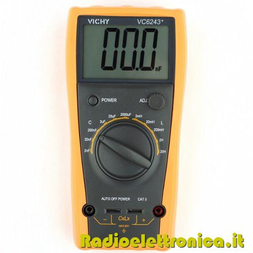 Digital LC meter LC Meter digitale per la misura di capacità e induttanze. Alimentazione a batteria. Custodia antiurto, completo di puntali. Descrizione del prodotto Descrizione: * Capacità: 2nF/20nF/200nF/2uF/20uF/2000uF, ± (2,5% +10) * Induttanza: 2mH/20mH/200mH/2H/20H, ± (2,5% +10) Indicazione bassa della batteria *: ca . meno di 7.5V * Spegnimento automatico: Si spegnerà dopo circa 30 minuti senza alcuna misura. * Frequenza di campionamento: 3times / s * modo di funzionamento: gamma manuale * max. Display: 1999 * LCD Dimensioni: 65 × 41 millimetri : 3.0" * Batteria: 9V (6F22) (batteria inclusa) * Perdita di potenza: corrente di riposo ca. 4mA Contenuto della confezione: * 1 x LC meter VC6243 + * 2 x puntali di misura * 1 x manuale Codice Prodotto: VC6243+