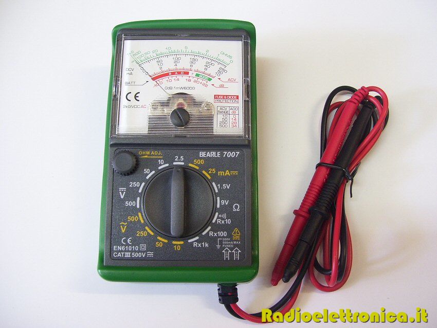 Analogue Multimeter BEARLE 7007 Multimetro analogico in un comodo e compatto alloggiamento antiurto 4 funzioni regolabili con selettore manuale. DC voltage: (DCV) 0 ~ 2.5 ~ 10 ~ 50 ~ 250 ~ 500V AC voltage: (ACV) 0 ~ 10 ~ 50 ~ 250 ~ 500V DC Current: (DCA) 0 ~ 25 ~ 500mA Resistance: (?) 0 ~ 10K? ~ 100K? ~ 1M? 5.0 level (arc length) Scala a specchio per l'accurata lettura della misura Resistenza di ingresso 2kOhm, buzzer Protezione di sovraccarico per vAC /vDC Misure: 132 X 76 X 42 mm Batteria: 1.5V AA Peso: 235g