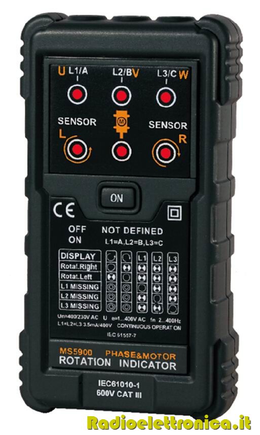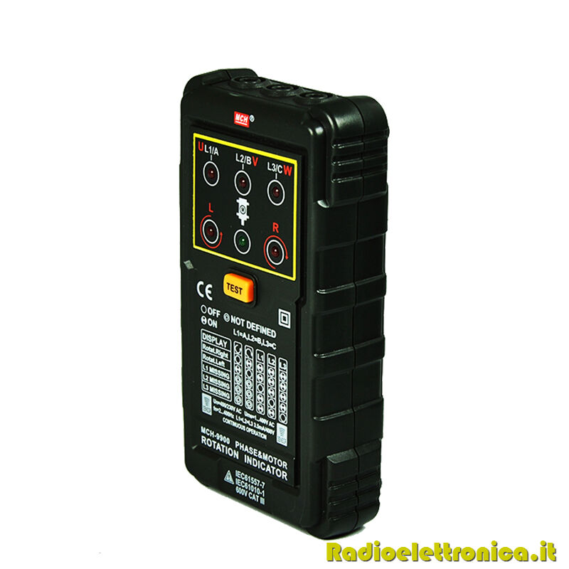 L'indicatore di rotazione del motore e delle fasi MCH-9900 viene utilizzato per testare la direzione del campo magnetico del sistema trifase, la rotazione delle fasi, la direzione di rotazione del motore.