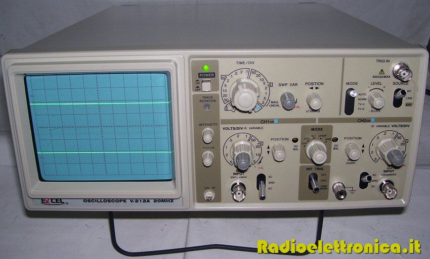 Oscilloscopio EXCEL V-212A Oscilloscopio analogico ATTEN V-212 A due canali 20Mhz - Modello : V-212 20MHz - Schermo : 6 "schermo con divisione interna linee: divisioni 8x10 (1 divisione = 1cm) - Tensione di accelerazione : 1,9 kv - Fosforo in polvere : P43 standard - Fuoco : Regolabile - Traccia di rotazione : Regolabile - Controllo della luminosità : Regolabile - Modo : CH1, CH2, sovrapposizione, l'alternanza, intermittente - Fattore di deflessione : 5mV/div a 5V/div: 10 intervalli, regolazione continua secondo il 1-2-5 scala con un rapporto di 1:2.5. (Per 5 volte. 1mV/div a 1V/div per 10 intervalli) - Precisione : Normale: + / -3% Amplificazione: + / -5% - Tensione ingresso : 250V (DC + AC p.p.) - Ingresso accoppiamento : DC-terra-AC - Tempo di salita : ? 17.5ns - Reazione polare - Modalità di visualizzazione : 1, 10, XY - Base dei tempi : 0.2us/div a 0.2s/div: 9 campi, regolazione continua tra le gamme con un rapporto non inferiore a 1:2.5 - Scansione di espansione larghezza : x10 - Precisione : 3% - Resistenza d'ingresso - Modo : Auto, NORM, TV-V, TV-H - Sorgente di trigger : VERT, CH1, LINE, EXT - Sensibilità e frequenza: 20Hz-20MHz (VERT) INT: 0.5div EXT : 0.5Vp-p - Gamma : TV-H Più di 1 o 1,0 Vp-p - Esterni innescando resistenza d'ingresso - Tensione di ingresso : 250V (DC + AC valore di picco) - XY fase : Meno di 3 (DC-50KHz) - Campo di tensione : 220V/110V + / -10% - Fusibile : 0.5A/1A - Frequenza : 50Hz/60Hz - Dimensioni : 310 (W) x 130 (H) x 370 (P) mm - Peso : 6 Kg - Temperatura : Funzionamento nominale di temperatura: da +10 º C a 35 º C ; Temperatura di esercizio: 0 º C a 40 º C - Umidità : Campo di funzionamento nominale: 45% -85% RH ; Raggio d'azione: 35% -85% RH.