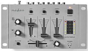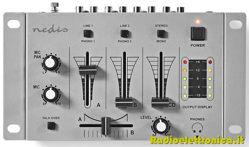 Mixer DJ essenziale e compatto, adatto per collegare e mixare tre sorgenti audio.