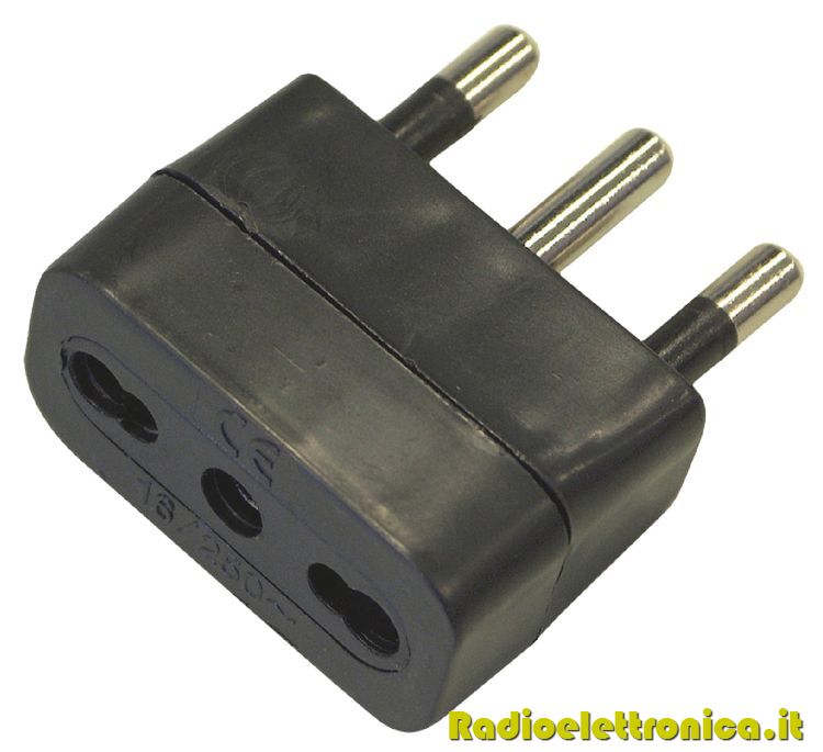 Adattatore da spina italiana 16A (tipo grande) a presa bipasso 10/16A (per spine piccole e grandi) con presa di terra.