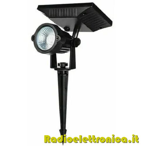 Faretto a led segnapasso con picchetto dalla potenza di 10W. Puo essere montato e spostato in qualsiasi parte del vostro giardino in quanto funziona con ricarica solare tramite pannello e quindi non necessita di installazione cablata.