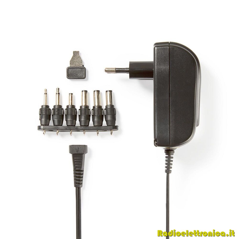 Alimentatore universale compatto e super efficiente da 1500 mA con uscita 3-12 V ed indicatore a LED. Comprende 6 connettori intercambiabili che rendono questo alimentatore adatto per molti dispositivi.