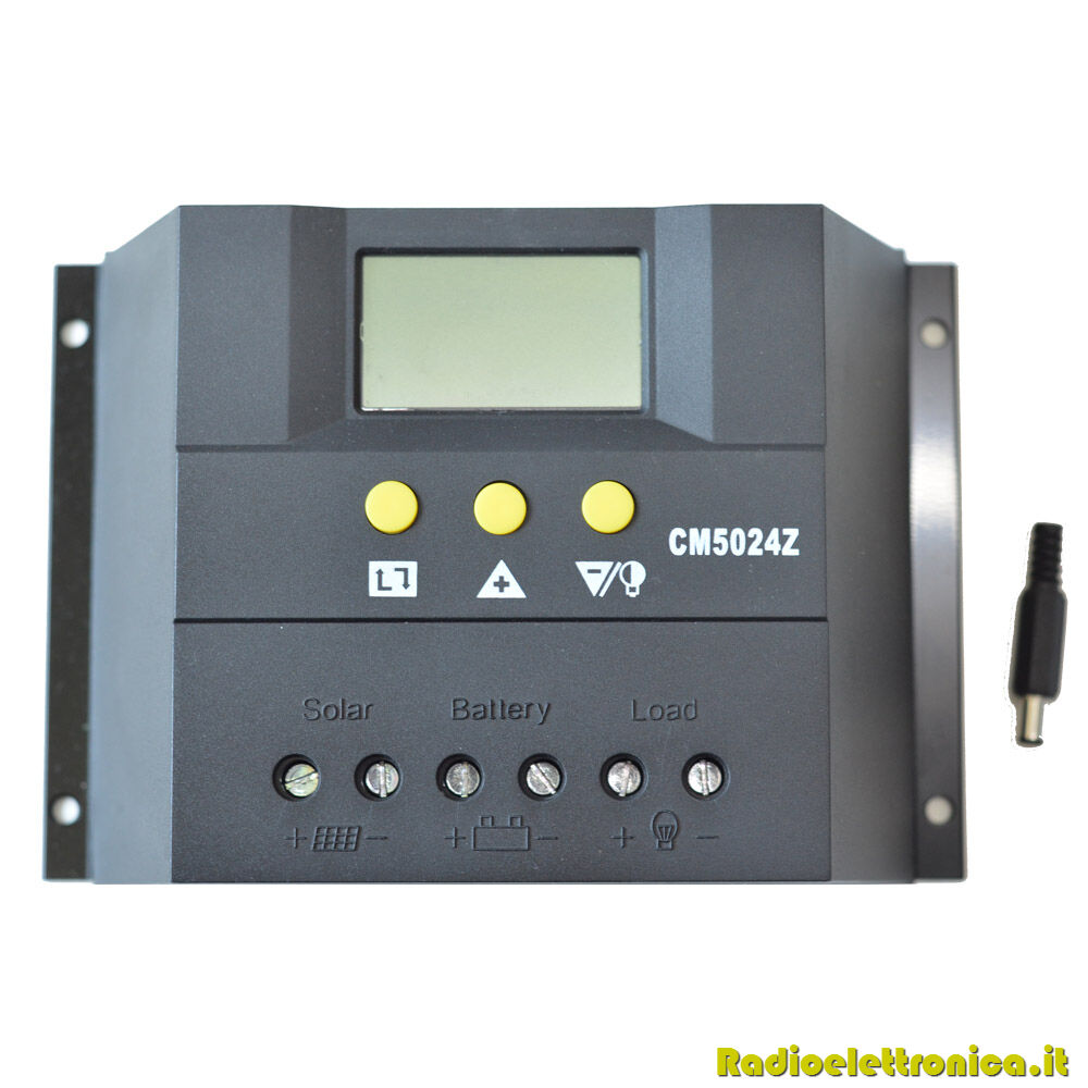 Regolatore di carica professionale CM5024Z 50A 12/24V con aletta di raffreddamento in alluminio, schermo LCD con indicazione delle funzioni, tensione di ingresso fino a 50V e tensione di carica batteria con adattamento automatico.