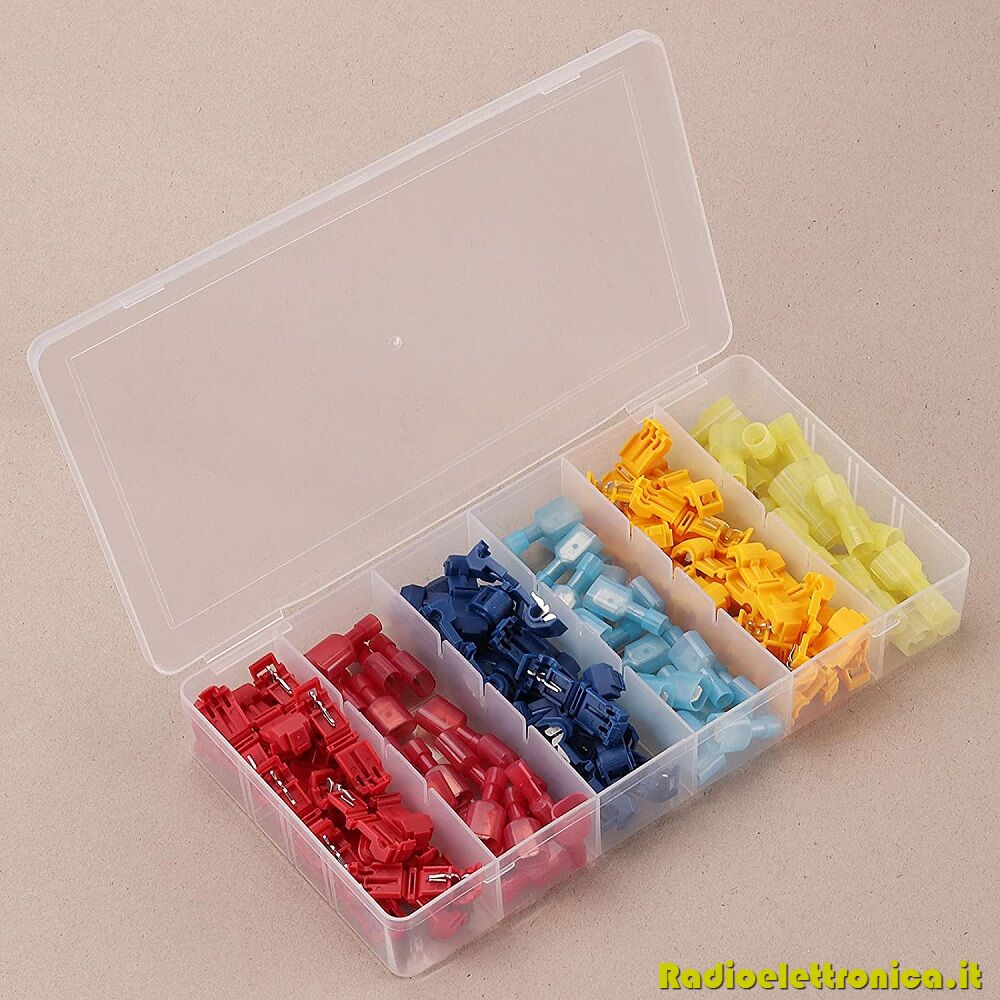 - 60 set di connettori a filo T-Tap, inclusi con tre modelli T1 rosso, T2 blu e T3 giallo