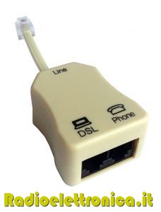 Questo splitter/microfiltro ADSL permette la separazione tra la linea analogical telefonica e la linea digitale ADSL.