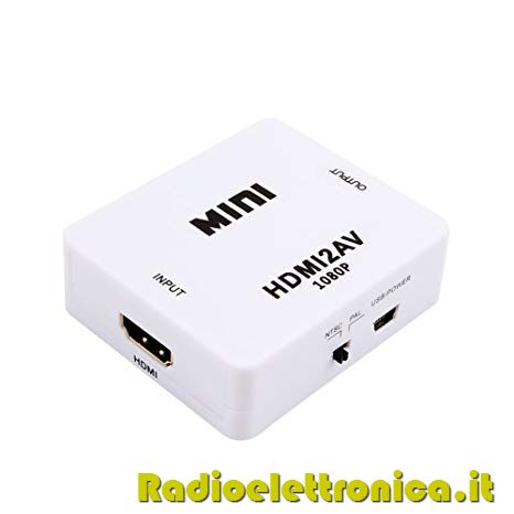 Adattatore convertitore di segnale video e audio da digitale ad alta definizione HDMI, ad analogico RCA. Potrete visualizzare il segnale in alta definizione proveniente da: lettore blu-ray, computer, console videogiochi, decoder, cromecast, ecc. nelle vostre vecchie tv che hanno gli ingressi RCA. Il convertitore va alimentato, nella confezione è incluso il cavo di alimentazione USB, come alimentatore potrete usare un qualsiasi caricabatteria USB da parete per cellulari (il caricatore non è incluso nella confezione)
