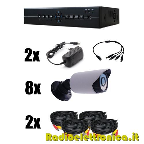 Il kit è composto da: n.8 Telecamere 3.6mm 20 LED CCD 540TVL; n.8 cavi da 20mt per collegamento segnale video-alimentazione; 1 DVR H.264; 2 Alimentatore 12V 2A;Videoregistratore professionale con codifica H.264 controllabile anche da remoto via LAN in INTERNET. Utilizza lo standard H.264 che garantisce alta qualità, tempi di registrazione più lunghi, prendendo meno risorse di banda e minor spazio sull’HD.Interfaccia OSD, mouse USB e telecomando. Supporta la risoluzione D1 con possibilità di regolare la qualità delle immagini registrabili. Modalità multiple di registrazione: Auto, timer, modalità di registrazione di movimento (speed motion).Supporto di più canali di riproduzione allo stesso tempo (supporta la riproduzione 8CH contemporaneamente) Supporta il monitoraggio in rete: utilizzando uno dei seguenti browser supportati: IE, Chrome, Safari, Firefox. Supporto DHCP, DDNS, PPPoE e servizi di rete NTP. Modalità di backup: USB e backup di rete Tecnologia P2P con Server Cloud per gli utenti con indirizzi IP pubblico dinamico. Se vi hanno detto che per poter vedere le vostre telecamere via internet occorra un indirizzo IP internet statico o sia necessario essere esperti informatici per configurare le porte di rete del vostro router, tranquillizzatevi: con questo DVR non sarà più così. Il DVR supporta la tecnologia P2P e si collega in tempo reale ai server CLOUD del fornitore per facilitare al massimo il collegamento via web. Basta sincronizzare nell’apposito menù l'indirizzo ID che trovate sul DVR per poter essere immediatamente on-line e vedere le vostre telecamere attraverso il web. Supporto visualizzazione remota da Cellulare (Symbian, iPhone, Android, Windows Mobile) Uscita VGA e BNC. Caratteristiche: Chipset: Hi3515 Compressione: 8CH H. 264 8CH BNC video input/1CH video output 1CH BNC audio input/1CH audio output Risoluzione D1 per registrazione e playback. Supporta: VGA/ PTZ HDD: 1*SATA (1TB max) Dimensioni: 210(L)x280(W)x40(H)mm Alimentazione: 220V±10% 47Hz~63Hz Temperatura di utilizzo: -10°C—+55°C Potenza assorbita: 10W (senza HDD) Peso: 4.5 Kg circa